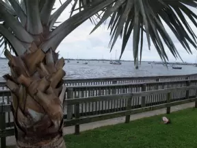 Waterfront park with amazing colors in the water- views of an island and blue-green sandbars. Plenty of benches and docks, and a playground.