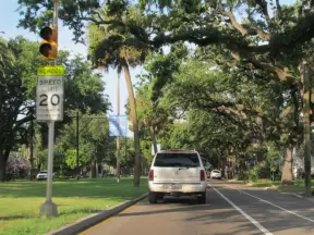 Hilly town with old and new capitol, and some pretty streets covered in a jungly canopy.
