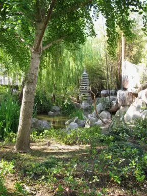 Pleasant garden with waterfall, huge lizards, boulders, pavilions with lovely circle windows and distinctive roofs, and pond, but some city noise.