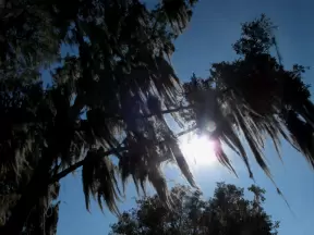 Short walk around shimmering lake with moss-draped trees, past Spanish mansions.