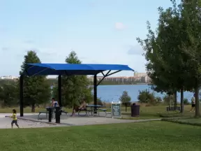 A huge beautiful park with lake, turtle and frog sculptures, lighthouse, boat to climb in, splash pad, workout equipment- you name it they have it! Four play areas!