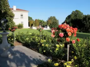 Picture-perfect rose gardens, below a grassy green hill across the street from where the Santa Barbara Mission stands.