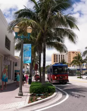 Main strip of West Palm Beach, with colorful and inviting architecture and decorations.
