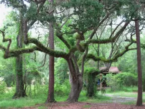 Tropical paradise with amazing trees, soft green grass, and woven huts shading picnic tables with BBQs that line the river, plus bike and kayak rentals. Beware alligators.