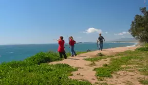 A walk along a clifftop to a popular surfing area with gorgeous sand dunes and exotic plants.