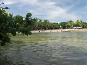 Large lagoon with clear water where kids can swim, tons of shade, and playground in the sand.