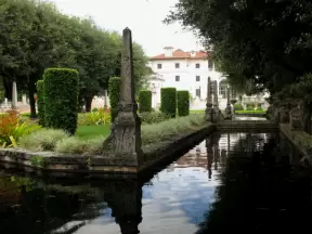 Glorious gardens with classical statues, fountains, topiaries, reflecting pools with bronze sculptures, flowers, orangerie, and secret groves.
