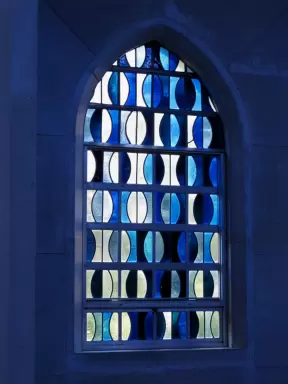Stunning Spanish Renaissance style church with peaceful blue interior and Tiffany glass windows.