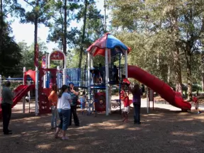 Super fun playground with merry-go-round and tons of climbing structures, all under the shade of tall trees.