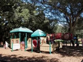 Huge park that feels like a retreat in the woods- playgrounds and pond with ducks!