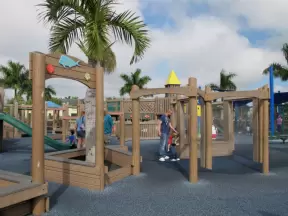 Tropical park with sky-high playground for older kids, toddler playground, fitness trail and stations, pale-lime gazebo, and spiffy basketball courts.