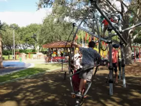 Super fun playground with merry-go-round and tons of climbing structures, all under the shade of tall trees.