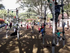 Super fun playground with merry-go-round and tons of climbing structures, all under the shade of tall trees.