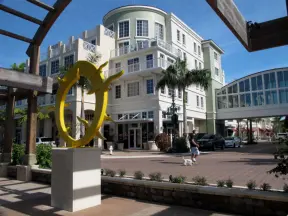 Main strip of West Palm Beach, with colorful and inviting architecture and decorations.
