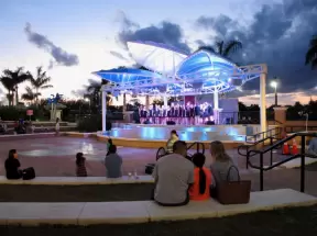 A happening spot with a sunken amphitheater by the water where kids can run in a splash pad and fountains are lit up at night. BurgerFi, Subculture Coffee, and a few restaurants.