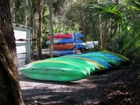 Tropical paradise with amazing trees, soft green grass, and woven huts shading picnic tables with BBQs that line the river, plus bike and kayak rentals. Beware alligators.