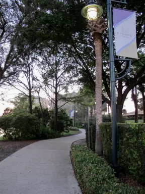 Gorgeous wetland area with wooden pier and promenade with blue benches. Steps from cute cafes and coffee shops of downtown Clermont.