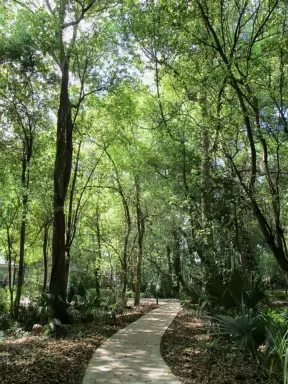 A short walk on a paved path through gorgeous tropical jungle and forest to a gazebo overlooking a small lake.