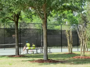Running trails under incredible tall trees, large playground, and tennis, racquetball, volleyball and basketball courts.