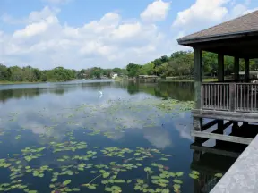 Short walk around shimmering lake with moss-draped trees, past Spanish mansions.