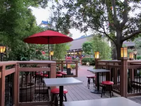 Sit here on a red brick terrace in the sun and look out on the colored umbrellas and bell tower.