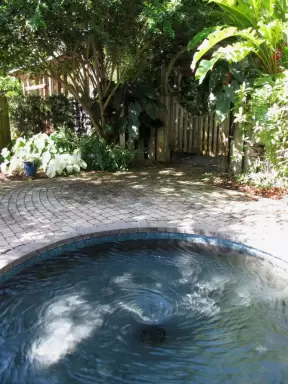 A tropical wonderland of palms, ferns, bromeliads, fountains, sculptures, rocks, ironwork gates, and pergolas, with the delightful scent of flowers filling the air.