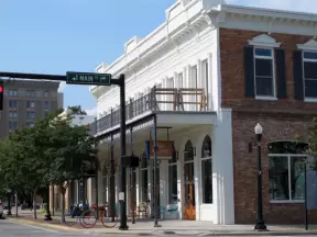 Main street in Mobile, with historic buildings with wrought-iron balconies.