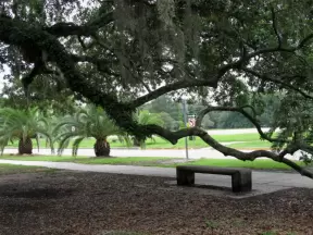 Short walk around shimmering lake with moss-draped trees, past Spanish mansions.