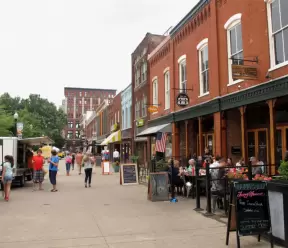 A main street of late 19th century storefronts, popular cafes, and a hip college scene. Recently, suffering an epidemic of homelessness relating to mental health problems.