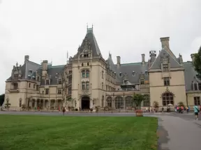 Impressive, stately building atop a hill, with lovely gardens and statues, and a fountain in the middle if the street.