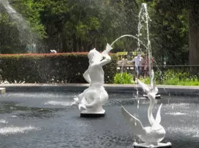 A tropical wonderland of palms, ferns, bromeliads, fountains, sculptures, rocks, ironwork gates, and pergolas, with the delightful scent of flowers filling the air.