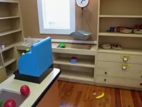 Attractive children's museum with market and carts, Newton's playhouse where you can shoot balls, ball pit, fire engine, oak tree tunnels, stage, dress-up area, and pizza kitchen.