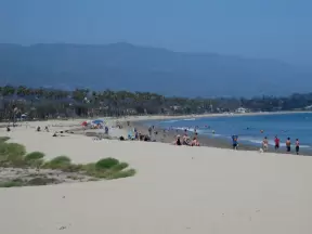 Large windy beach with fun dunes to play on, a bike path, and a grassy picnic area in a valley set back from the beach.