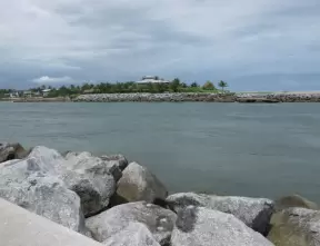 Beach where fishermen hang out on the jetty and surfers come to ride the waves at Jupiter Inlet.