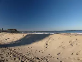 A glorious beach in Grover Beach town, with sand dunes and a wooden boardwalk, plus an octagon-shaped wooden pier in the sand.