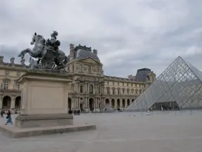 A glass and metal pyramid in the entry courtyard of the Louvre Museum, truly glorious at night!
