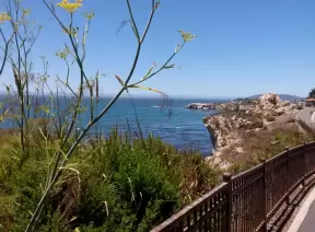 Wealthy neighborhood with cliffs covered in wildflowers above the turquoise sea.