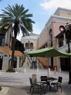 A beautiful outdoor mall with pink Mediterranean architecture, upscale shops and restaurants, and an art museum.