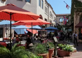 European-style mall in downtown San Luis Obispo with sidewalk cafes.