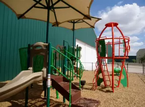 Large shady playground with fun three-person spinner swing. Bolin Creek bike path starts here.