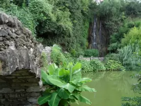 Pleasant garden with waterfall, huge lizards, boulders, pavilions with lovely circle windows and distinctive roofs, and pond, but some city noise.