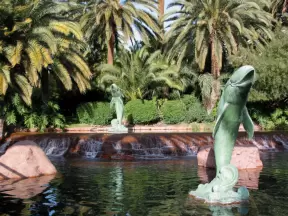 An oasis of lush landscaping, waterfalls galore, a volcano that erupts, and a classy casino with tropical fish tank.
