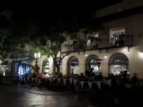 A small, attractive shopping center with cafes, boutiques, a coffee shop, a farmers market, and nice lights at night.