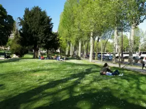 A large park with beautiful tall trees, playground with huge slides, gazebo, and a pleasant lake where you can rent paddle boats in summer.