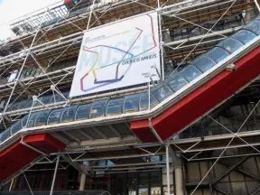 Modern art museum and public library with sunny, slanted square in front, and awesome modern art fountain.