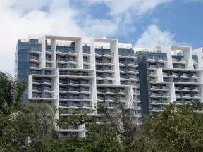 Beach with everything a beach should have: pale sand, aquamarine water, coconut palms, dunes, fit people, and cafes.