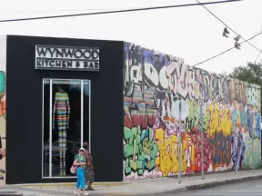 A trendy street in the middle of a sketchy neighborhood, with cafes and colorful graffiti-covered walls.