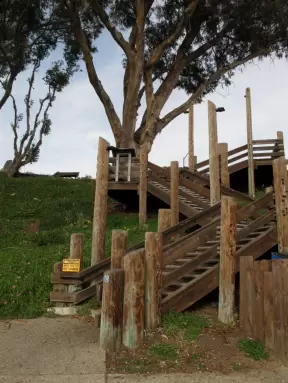 Cement ship playground with logs to climb, seal, dolphin, whale's tail and giant octopus sculptures, picnic tables, and an amazing view of Morro Rock and the inlet.