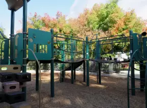 Large field with sweeping views, playgrounds, workout stations, picnic pavilions, and walking path around the field.