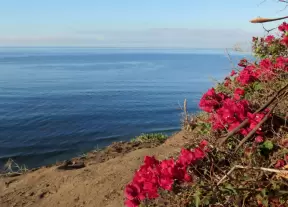 Wealthy neighborhood with cliffs covered in wildflowers above the turquoise sea.